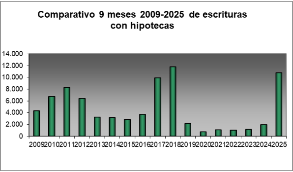 En cuanto a las operaciones con crédito, el CECBA informó que 1.486 escrituras se realizaron con hipoteca, lo que implica una suba del 110,8% frente a septiembre de 2024. En los primeros nueve meses del año se contabilizaron 10.827 escrituras con hipoteca, cifra que marca un incremento del 449,5% interanual.