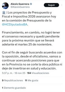 “Con el fin de seguir buscando acuerdos con la oposición, desde el oficialismo vamos a continuar acercando posiciones para que en la Provincia no se corte la obra pública ni deje de invertirse en salud y educación”, expresó el presidente de la Cámara de Diputados bonaerense, Alexis Guerrera.