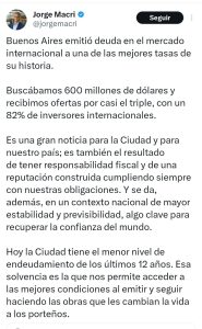 El jefe de Gobierno porteño, Jorge Macri, afirmó que la Ciudad de Buenos Aires logró una de las mejores tasas de su historia en la reciente colocación de deuda en el mercado internacional. Según informó, la administración buscaba financiarse por USD 600 millones, pero recibió ofertas por casi el triple, con una participación del 82% de inversores internacionales.